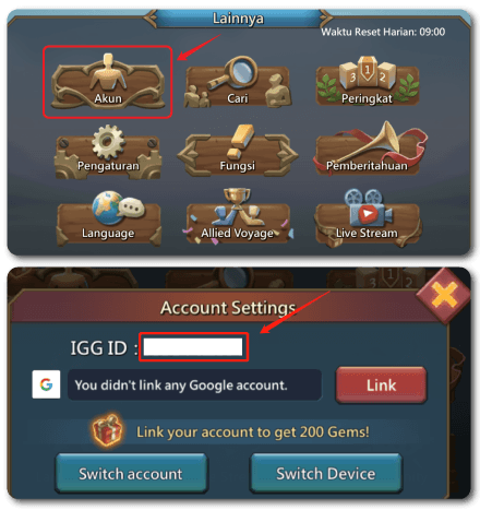 Untuk menemukan ID IGG, buka aplikasi Lords Mobile Anda. Klik pengaturan (Ikon Gerigi) yang terletak di bawah kanan layar, kemudian klik pada Akun Anda, ID IGG dapat Anda lihat tercantum disana. Silakan masukan ID IGG Anda di sini.